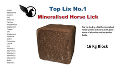 Top Lix No.1 is a highly mineralised horse specific lick block with good levels of vitamins and key amino acids that has been designed for the horse by horse people.