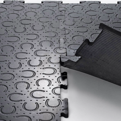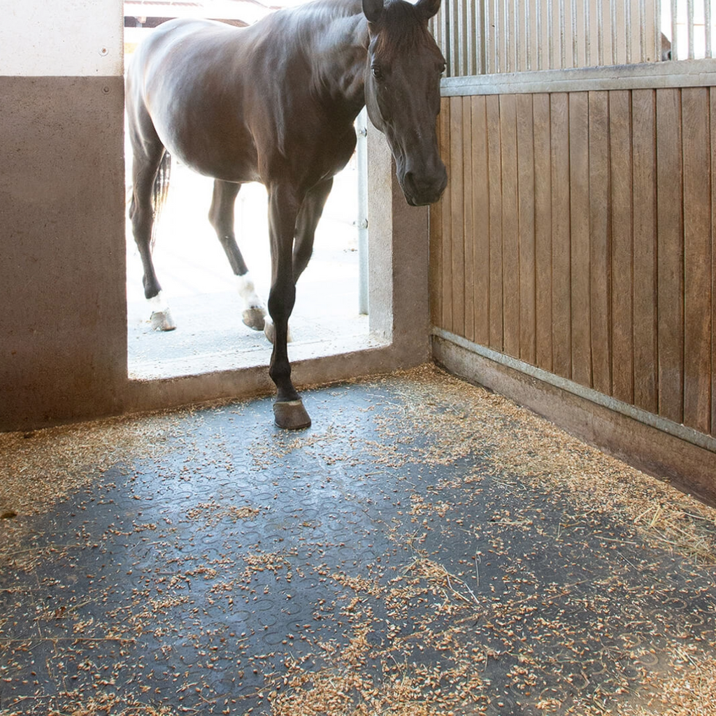 The tried and tested Surehoof Tile is particularly robust thanks to its reinforced surface. It is, therefore, also suitable for greater loads, e.g. heavy or restless horses. Surehoof is pleasantly soft, improves sure-footedness and provides support when getting up and lying down. The soft surface structure helps to reduce chafing, especially among sensitive horses, to a minimum. The vulcanized rubber mat is heat insulating and also compatible with vehicle traffic. Thanks to the precise puzzle interlock system, the mats can be simply installed using a floating method. The use of Surehoof loosebox mats reduces the need for bedding, the amount of dust and manure in the stable and the effort required for maintenance!